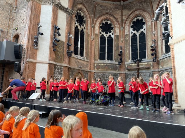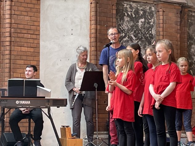 Zum großen Finale versammelten sich alle rund 70 Kinder noch einmal gemeinsam auf der Bühne. Mit den Liedern aus dem südlichen Afrika „Sanna sannanina“(„Lobt den Herrn!“) und „Sani bonani?“ („Was machst du?“) sorgten sie für einen schwungvollen Ausklang. Hand in Hand zusammen mit ihren Eltern und Großeltern sangen alle und beendeten das Konzert gemeinsam – mit Melodien im Ohr und Sonne im Herzen.