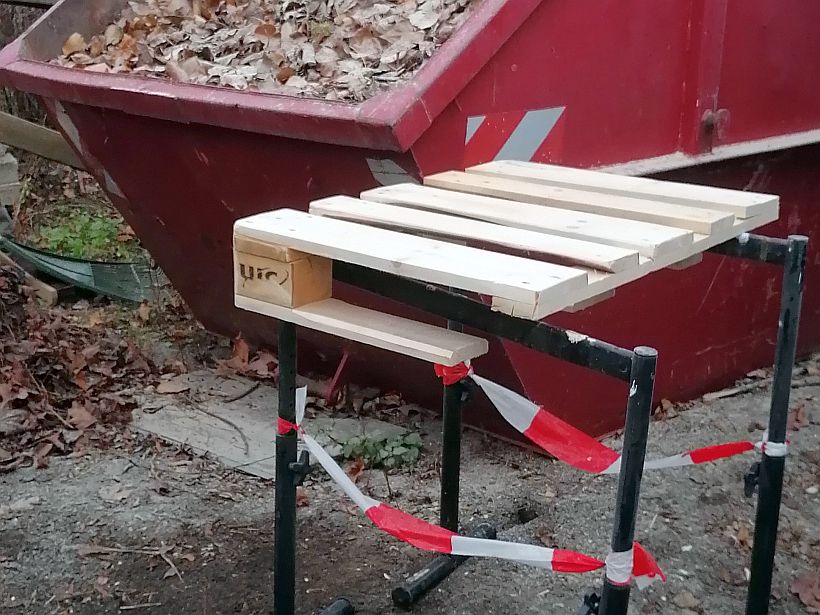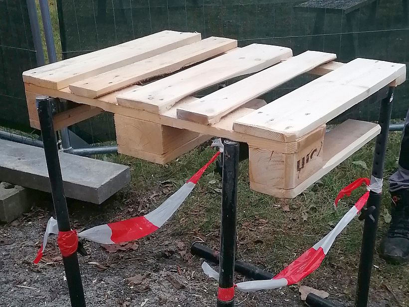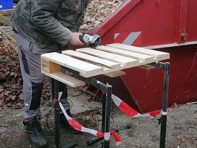 Anfang Dezember 2020 hatte der Praktikant unseres Hausmeisters gut zu tun. Europaletten, wie sie in jedem Baumarkt zu bekommen sind, hat er abgeschliffen. Schön glatt, ohne Grate und Splitter und mit abgerundeten Kanten waren die Europaletten große Puzzleteile für ein wunderbares Projekt für die Kita "Gorbitzer Früchtchen" des Omse e.V.