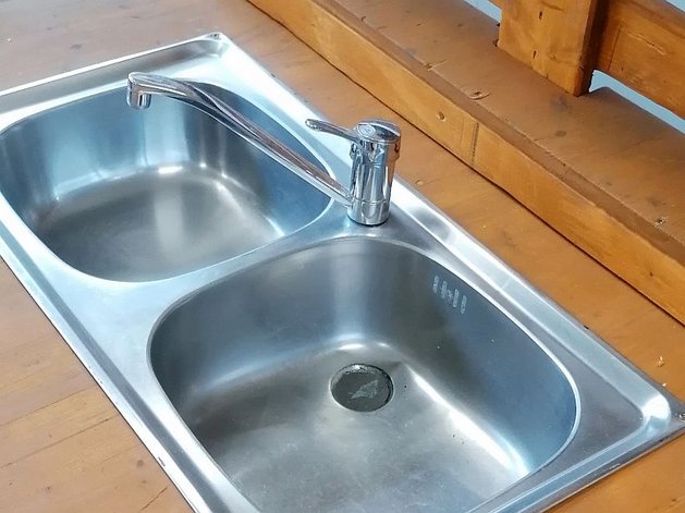 Die beiden Elemente der Matschküche können frei positioniert werden. Der Herd hat eine Kochfläche aus vier runden Holzscheiben und zugehörigen Knäufen für die Temperatureinstellung. Die Knäufe können sogar gedreht werden. Die beiden Waschbecken besitzen einen echten Wasserhahn. Am Durchlauf gibt es allerdings keinen Schlauch.