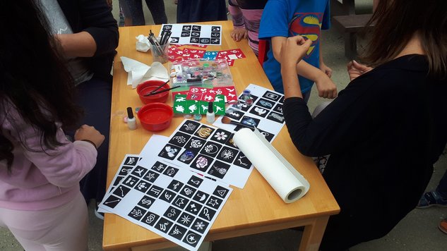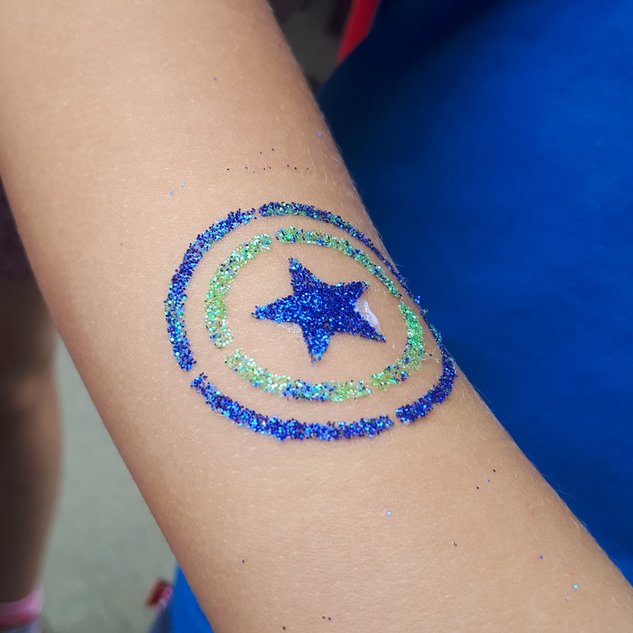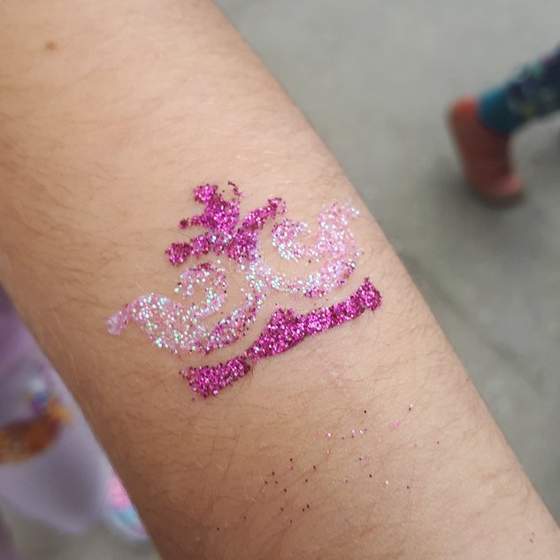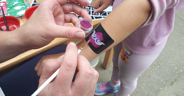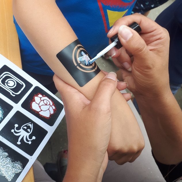 Mit Glitzerfarbe und etwas Wasser am Pinsel brachten die erfahrenen Pädagogen*innen, dass geniale Tattoo an die Haut.